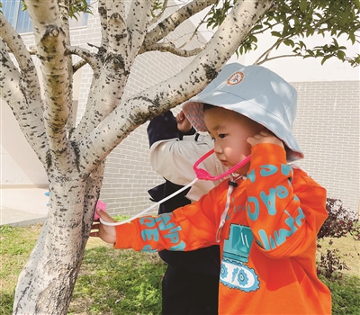 阳春三月,衢州市衢江区高家镇中心幼儿园开展了拜访春天、探索春天、画画春天等活动,师幼一起寻找幼儿园里的春天。图为幼儿在为大树“听诊”。