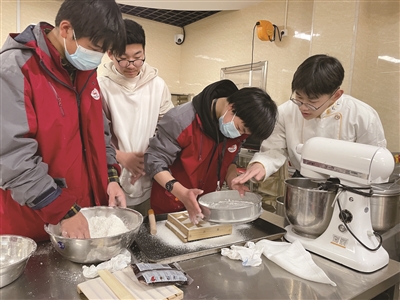 除了菜肴制作的常规知识、技能要点,课程中还增加了文化典故。“美食是文化的载体,我们希望学生能在烹饪学习的过程中接受传统文化的熏陶,改变‘烹饪只是烧菜烧饭’这样的刻板印象。”马海峰说,“比如今天制作的堰兢糕,很多人都不知道它又叫‘李卫眼睛糕’,这个名字与清代李卫督建盐官海塘有关,老师会在课上详细讲述这背后的故事。”