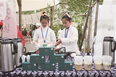 近日,上海尚阳外国语学校桐乡实验学校携手开化县城东小学,共同开展了一场爱心义卖活动。在乌镇集市,两校学生支起摊位,售卖亲手制作的风车、炒制的茶叶、冲泡的奶茶。本次义卖所得款项将全部用于购置物品,捐赠给山区的孩子。图为学生在售卖茶叶。
