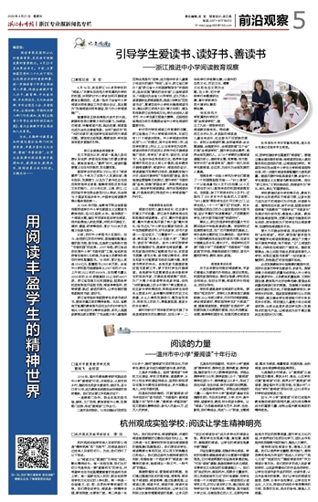 华东师范大学附属杭州学校打造“全阅读学校”,建立了九年一贯制学校的阅读新实践体系。特级教师王乐芬认为,多类型的阅读是儿童生命成长、社会参与不可或缺的部分。该校以全阅读环境、全领域阅读、全主题课程、全维度评价、全阅读联盟“五个全”打造“全阅读学校”,提升学生综合素养,培养全面发展的人。以18个学期的主题阅读课程为核心,建构有主题、有策略、有方案、有评价的“全阅读体系”,推动一到九年级学生爱阅读、会应用,为成长为全面发展的人奠基。